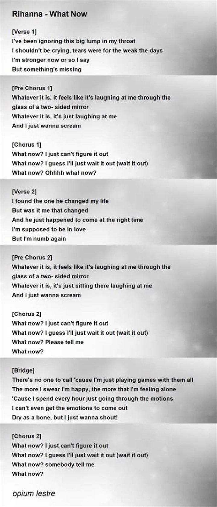 In conclusion, Rihanna's "What Now" lyrics continue to resonate with audiences, serving as a reminder of the universal struggles we all face. The song's exploration of vulnerability, self-discovery, and resilience makes it a timeless anthem for anyone navigating the complexities of life. As fans continue to connect with the song's emotional depth, "What Now" will undoubtedly remain a cherished piece of Rihanna's legacy.
